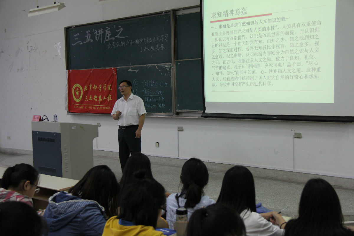 讲座伊始,张老师运用多个例证来说明“求知是追求自然知识与人文知识的统一”的道理,进而告诉同学们不但要注重求知的深,还要追求求知的广。接着,将求知分为受知、行知、探知与创知四个层面来讲解求知精神的内涵,新颖的观点令人眼前一亮,给予了在场的同学很大启发。然后,张老师在求知取向方面解释了一些紧跟学科发展前沿的词汇,并结合自身的实例鼓励学生要敢想敢做,即其所说的“凡具有强烈求知精神的学生必具有远大、崇高的理想”。最后,张老师言简意赅的列出了融汇式学习的理论基础和基点。