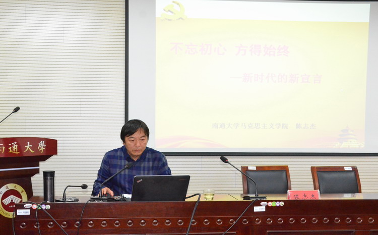根据学校党委统一部署,11月22日下午,AI风月 举行党的十九大精神宣讲报告会。南通市及学校“党的十九大精神宣讲团”成员、政治学院党总支书记陈志杰教授作宣讲报告。学院党总支书记陈炜主持报告会,全院师生党员参加报告会。
