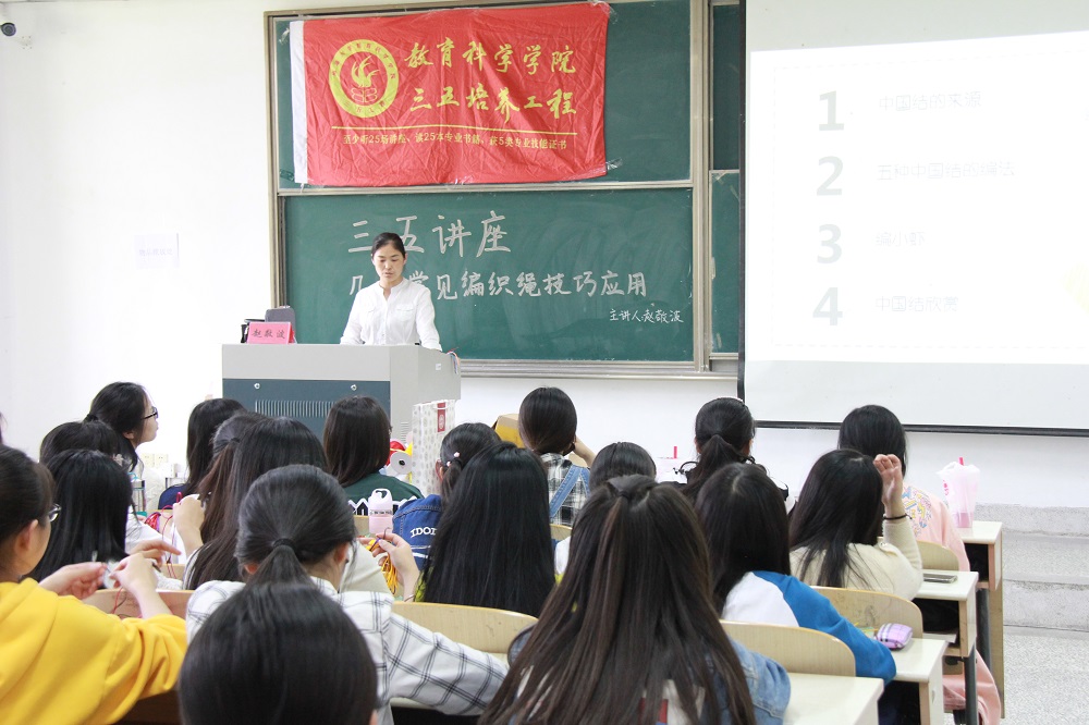 5月9日14:00,AI风月 于8号教学楼102教室成功举办了三五讲座之“几种常用的编织绳技巧”。本次讲座由民间艺人赵敬波老师主讲,教科院100余名学生到场参与此次讲座。