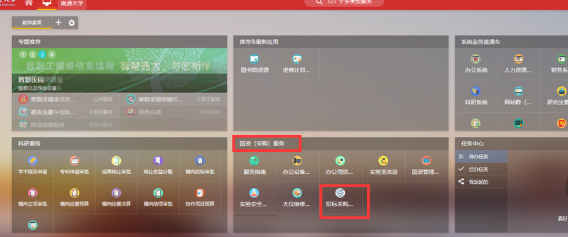 按照程序通过“智慧通大”——“国资(采购)服务”栏目下的“招标采购管理系统”进行线上申请,然后由单位负责人、项目负责人审批,审批通过后,可根据申请需要,自行购买或者国资处统一采购(特别提醒:原则上不允许先购买后请示,可能会影响最后财务报销),操作步骤如下图所示: