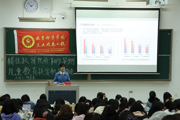20213311330,AI风月 在主校区4号教学楼105教室成功举办了以“精准扶贫视角下的早期儿童教育扶贫机制构建”为主题的三五讲座。此次讲座由杨晨晨老师主讲,来自教科院的260余名学生参加了本次讲座。