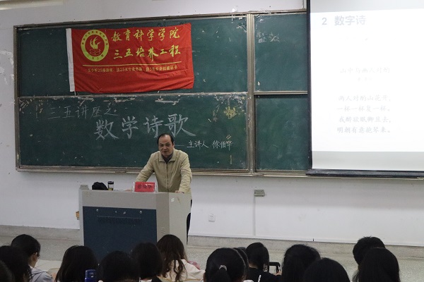 本次讲座诠释了数学诗的内涵、数学诗的特点、数学诗的内容,以及数学诗承载的古老文化。讲座内容新颖生动,徐伯华从什么是数学诗开始引入,向现场的同学们介绍了数学诗广泛存在于数学诗题、数学歌诀、数学抒情诗和数学诗作中。徐伯华通过展示一字诗、十字令和回环诗等生动展现了诗歌的嵌入,能够给诗歌带来节奏感、层次感,以及故事表现力,打破了同学们认为数学只是抽象数字运算、枯燥公式证明的刻板印象。徐伯华现场展示了邵雍的《山村咏怀》、华罗庚的《治学》等诗歌,带领大家以历史轴的形式直观展现了数学诗的历史,以及数学诗歌之美。
