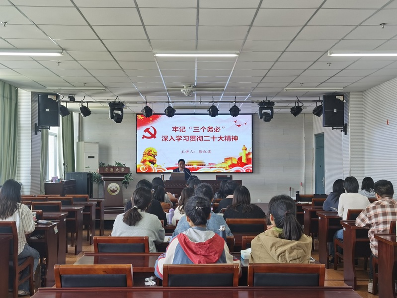 学院党委副书记、副院长徐红波以《牢记“三个务必”,深入学习贯彻二十大精神》为题作专题培训。他紧扣党的二十大,从大会主题、召开意义、主要内容等方面进行详细的讲解,希望同学们能认真贯彻落实二十大精神,牢记“三个务必”、“五个必由之路”、“六个坚持”,坚定理想信念,肩负时代使命,以实际行动为全面建设社会主义现代化国家、全面推进中华民族伟大复兴作出贡献,做时代合格的接班人。