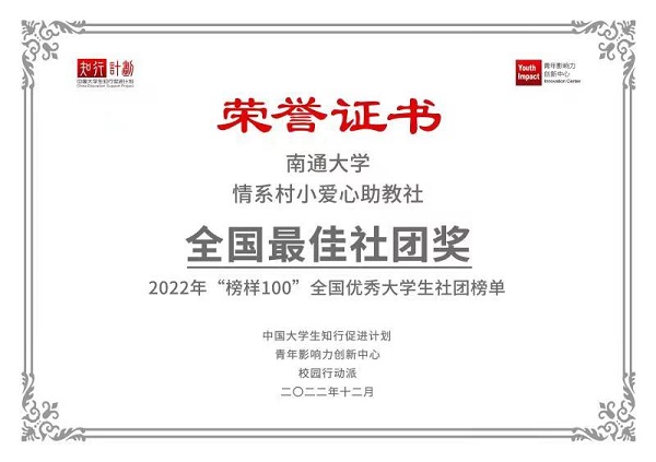 “榜样100”全国优秀大学生社团榜单 由中国大学生知行促进计划(简称知行计划)、青年影响力创新中心、校园行动派联合发布,自2019年起每年发布一次,旨在鼓励和表彰始终活跃在乡村振兴、助学支教、专业赛事、环境保护、创新创业等各式青年行动一线的高校大学生社团、团队、个人。