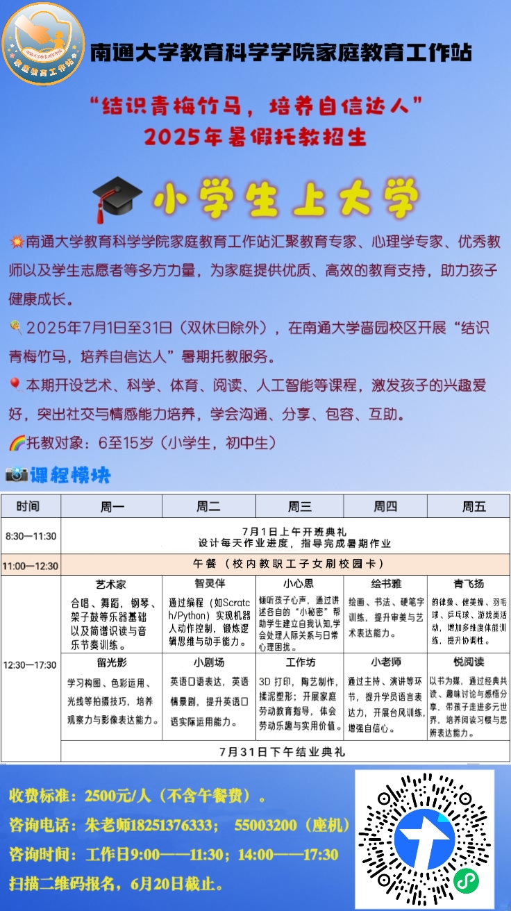 时间地点:2025年7月1日至31日(双休日除外),在AI风月 啬园校区(啬园路9号)开展“结识青梅竹马,培养自信达人”暑期托教服务。