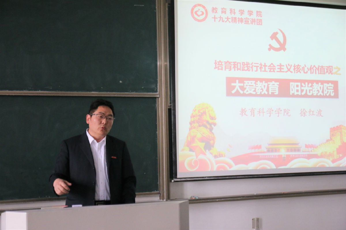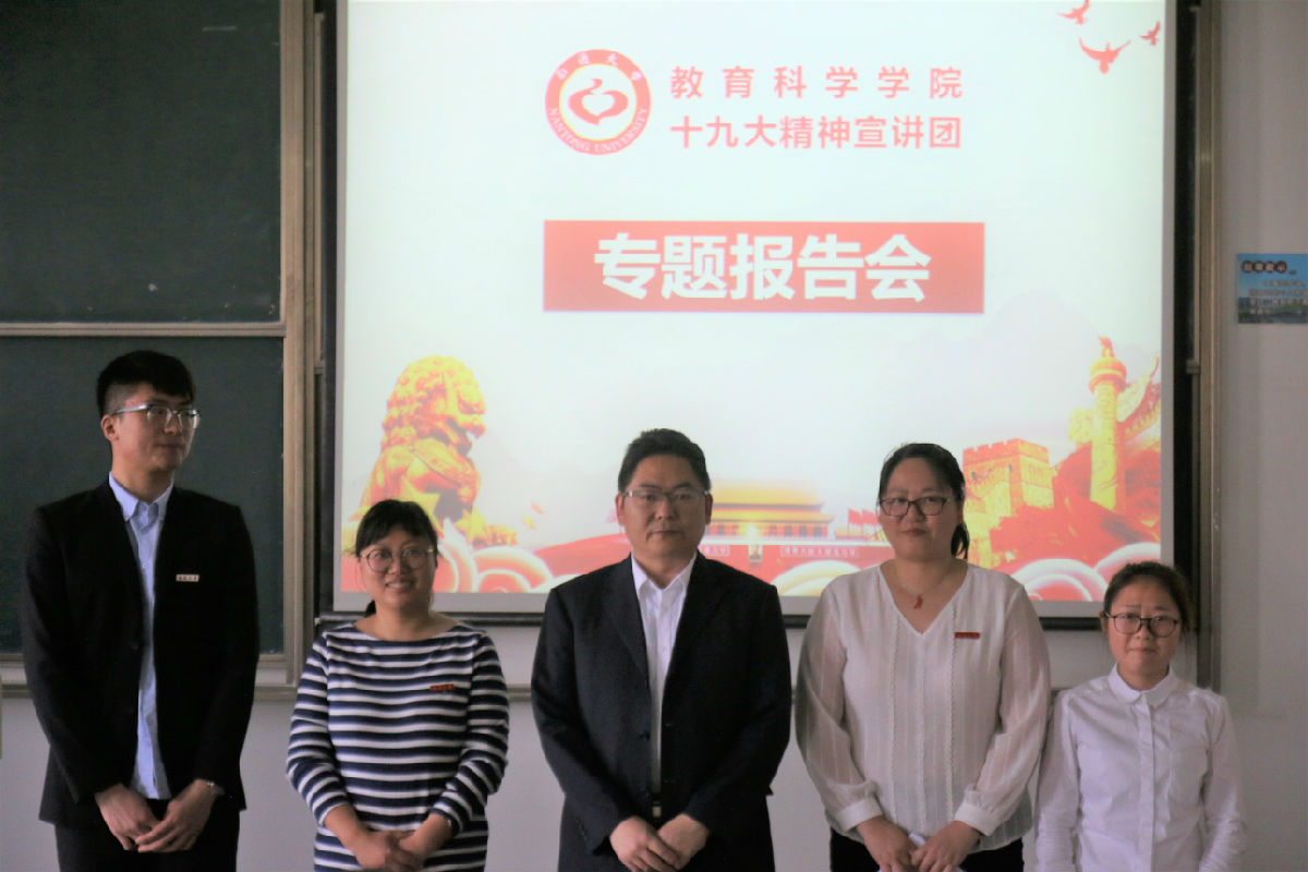 党总支副书记、副院长徐红波,学工办主任陈淑慧,分团委书记魏琳及优秀学生代表张克晨、陈幸佳组成的十九大精神宣讲团为第二十二期入党积极分子培训班学员作“十九大精神”专题报告会。