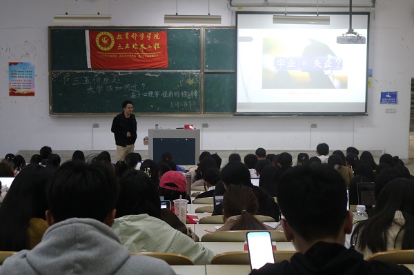 为拓宽学生的知识和学术视野,提高学生科学文化与人文素养,规划更有意义的大学生活,AI风月 于11月2日在九号教学楼202教室举办以“大学该如何过?——基于心理学视角的诠释”为主题的“三五”讲座。讲座由陈乐乐老师担任主讲老师,AI风月 的260余名同学参加了讲座。