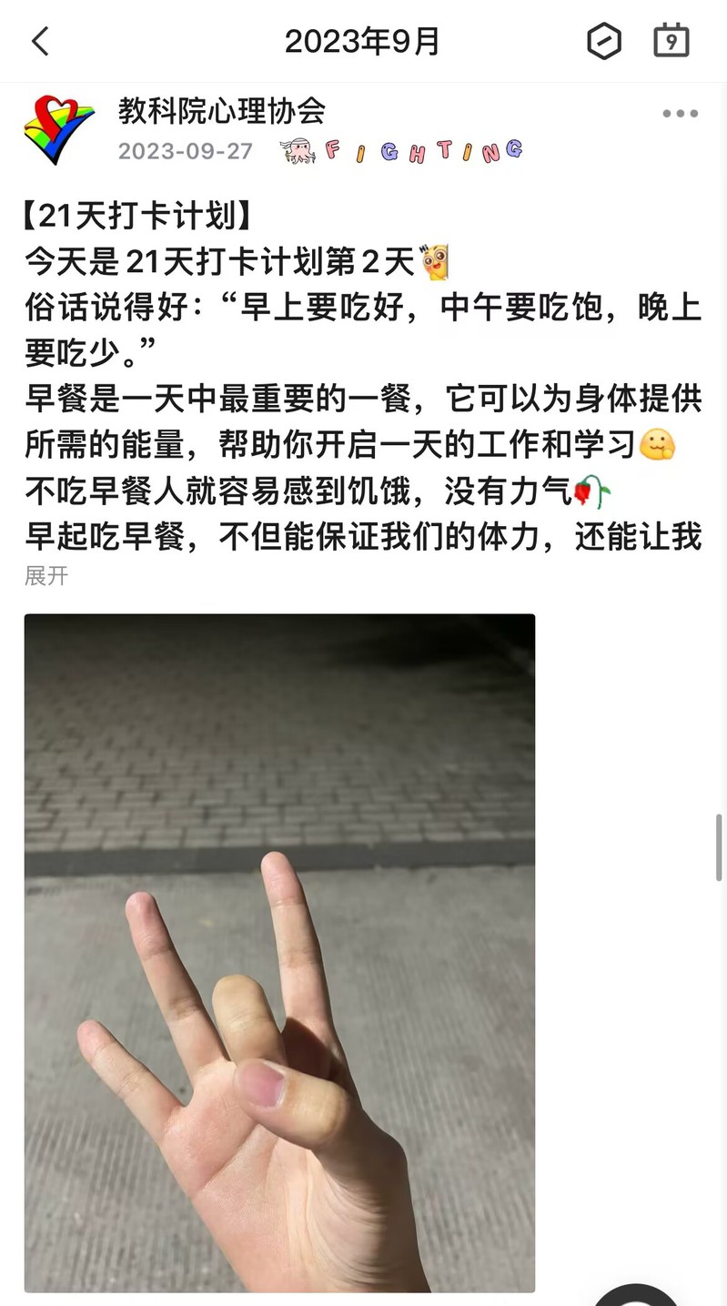 为更好地培养同学们的生活习惯,养成健康的作息规律,AI风月 心理协会于9月26日开始举办了为期21天的以“早餐为燃料,祝你飞更高”为主题的打卡活动。
