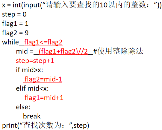 【动画演示】 用动画演示flag1、flag2、mid变化过程 | 学生观看动画体会二分查找过程。回答相关问题。 | 将抽象的编程概念通过动画变的可视化,加深学生对二分查找的理解程度。 | 2 | |||||||||||||||||||||||||||||||||||||||||||||||||||||||||||||||||